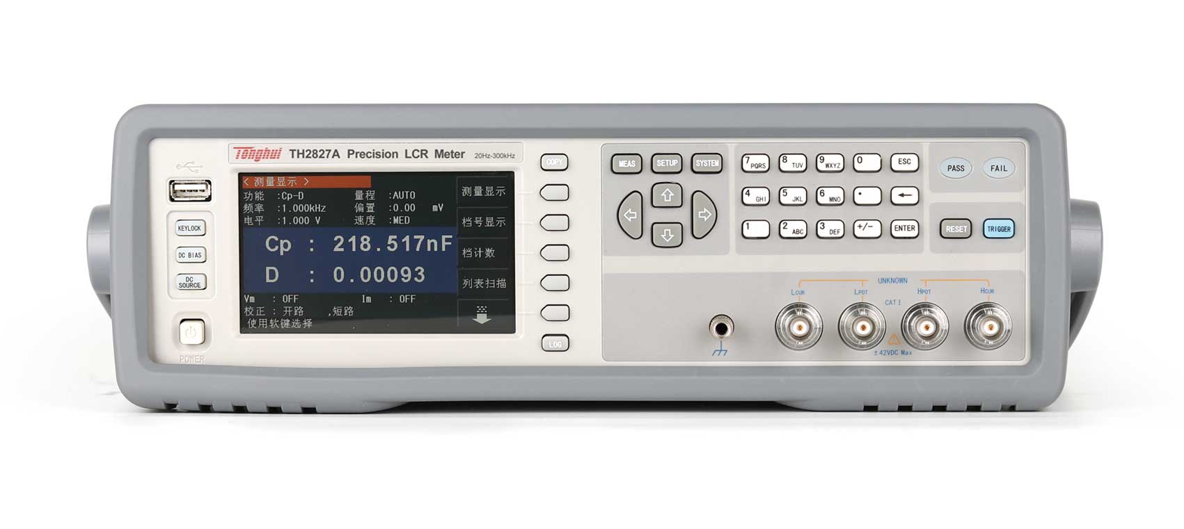 ■?TH2827A是具有多种功能和更高测试频率的新型LCR数字电桥,体积小,紧凑便携,便于上架使用。本系列仪器基本精度为0.05%,测试频率最高300kHz及10mHz的分辨率,4.3寸的LCD屏幕配合中英文操作界面,操作方便简洁。集成了变压器测试功能,提高了测试效率。仪器提供了丰富的接口,能满足自动分选测试,数据传输和保存的各种要求。