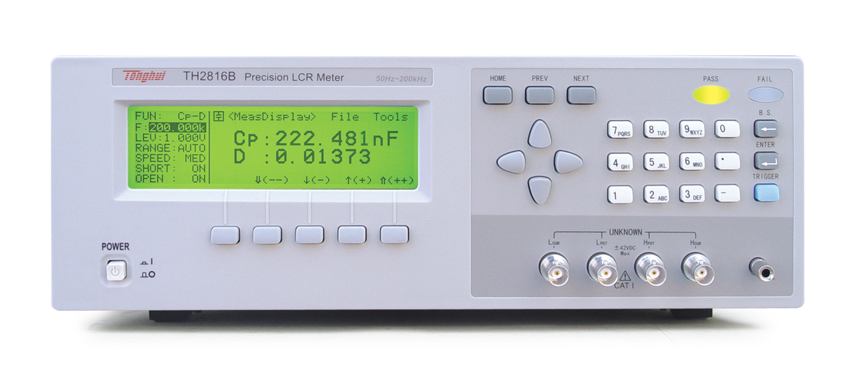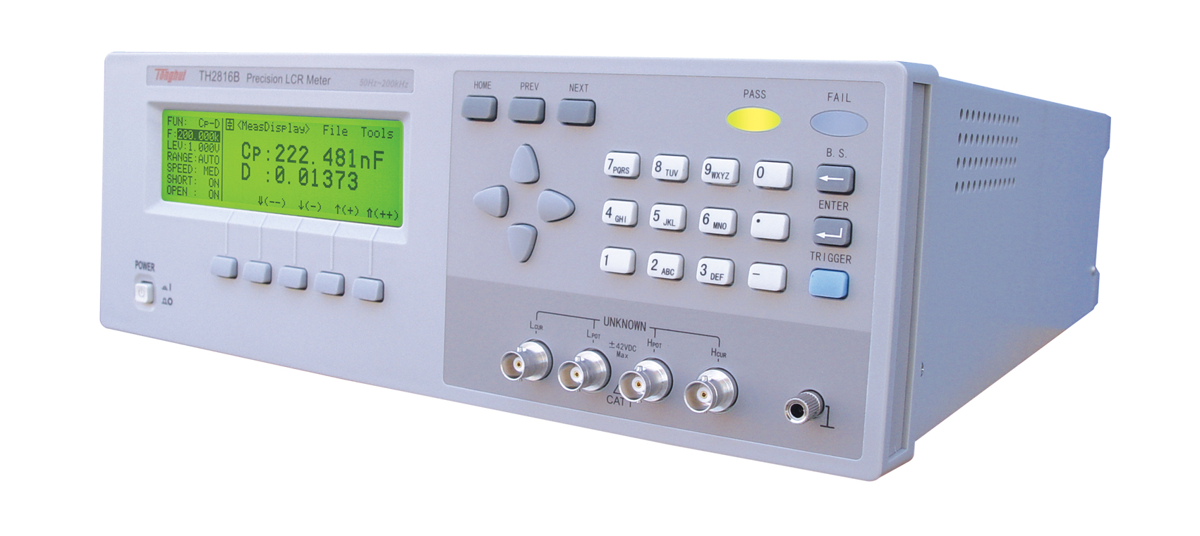 ■?TH2816B型精密LCR数字电桥集成了本公司多年元件测试的成熟经验。该产品强大的测试功能和优越的测量性能使其挤身于同类先进水平,结合以低廉的价格将给予广大客户超值的享受。该产品可提供稳定的6位测试分辨率,50Hz-100kHz/200kHz的频率范围、0.01V-2.0V可编程信号电平、高达30次/秒的测量速度、9级精细量程、恒定的30Ω或100Ω源内阻及灵活人性的操作方式, 可满足生产线质量保证、进货检验及实验室高精确度测量要求。该产品提供的HANDLER、GPIB及RS232C接口为仪器使用于元件自动分选系统、与计算机通讯及测试过程纪录创造了良好的条件。