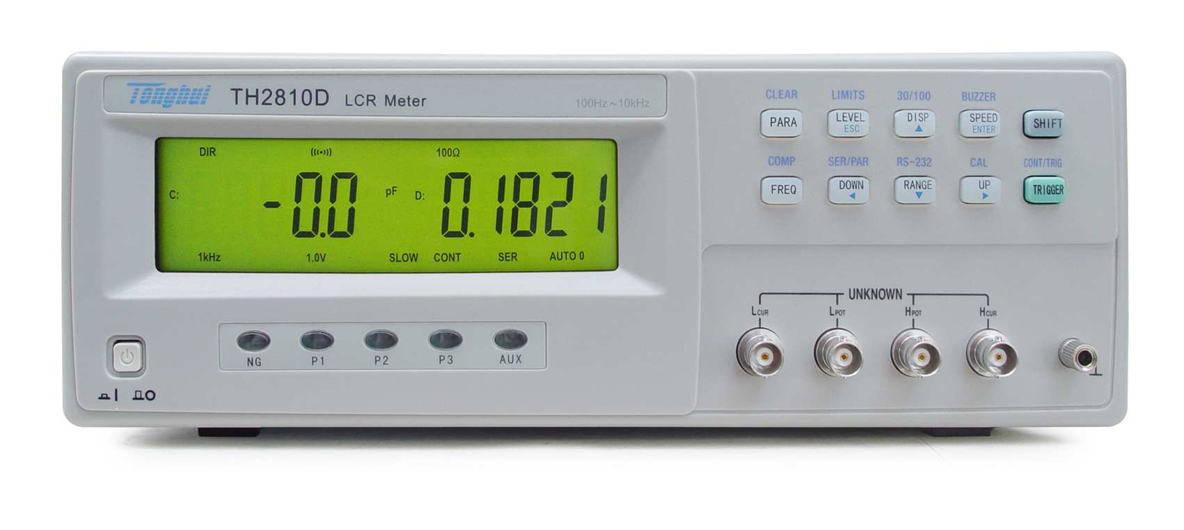 ■?TH2810D型LCR数字电桥是本公司最新研制的低频元件测量的换代产品, 其中应用多项元件测量的最新技术,大字符LCD显示,采用SMT贴片工艺,操作方便,外形美观。可满足生产线质量保证、进货检验及自动化生产的需要。?TH2810D为常州同惠最新推出的一款低价LCR数字电桥,在夹具方面采用了TH26004-1四端开尔文测试电缆加TH26001A?四端测试夹具以及短路片,精度为0.1%,内阻30/100欧姆。此外还有丰富的接口,RS-232和HANDLER接口等,可以连接电脑通讯及自动化测试。