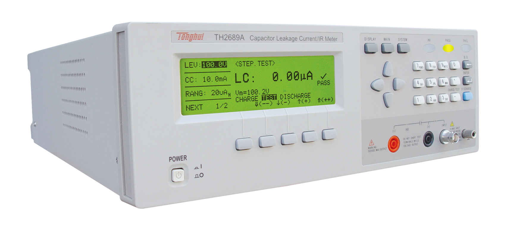 ■?TH2689A型电容器漏电流/绝缘电阻测试仪分别提供最大测试电压:500V,充电电流0.5mA~500mA(>100V时由最大输出功率50W限制)。主要应用于电解电容/陶瓷电容等漏电流,绝缘电阻及铝电解电容阳极箔耐压测试。也可应用突波吸收器,齐纳二极管,氖灯管等动作电压确认和漏电流测试。标配了RS232、Handler接口,可选购的GPIB接口,以及稳定快速的测量,使TH2689不仅可以应用于进货检验,更可应用于自动化生产测试等等。