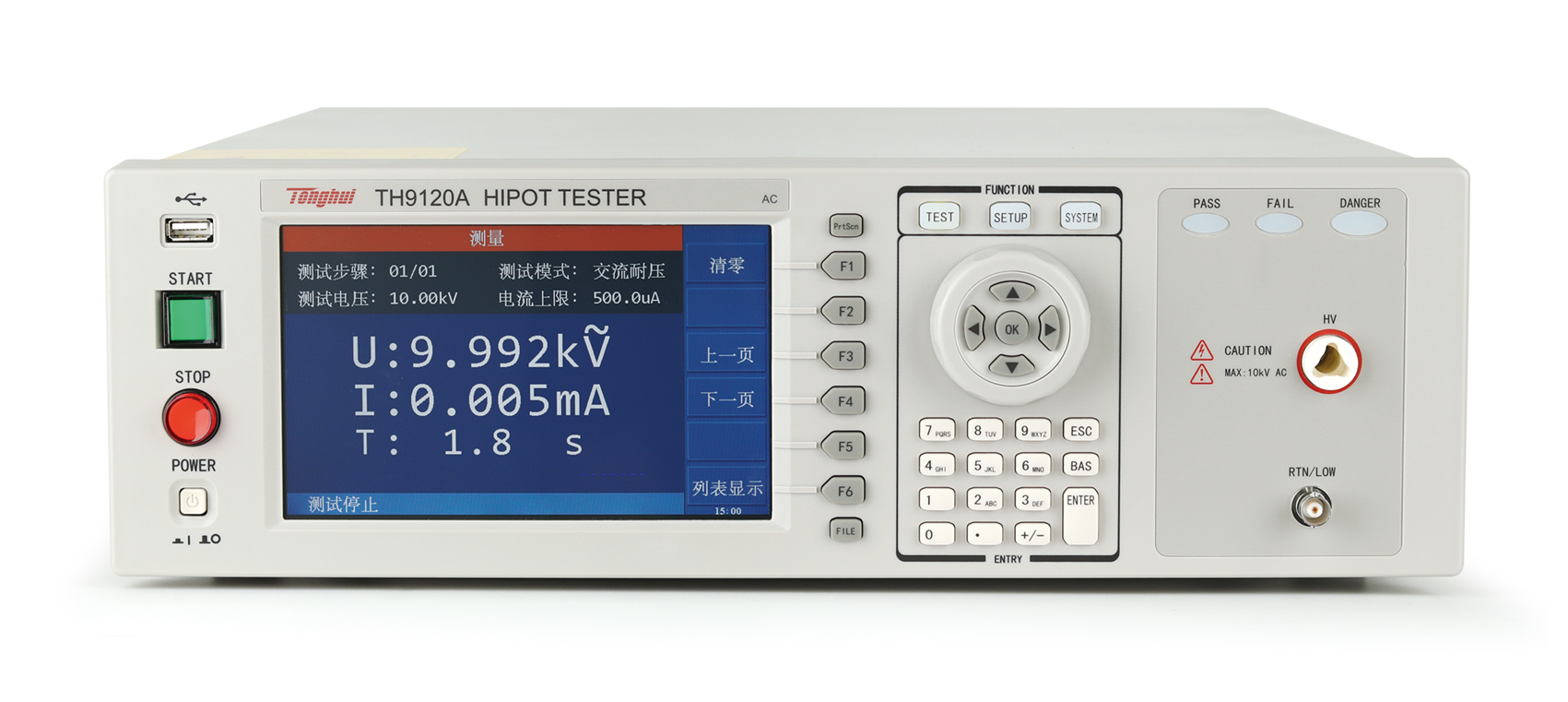 型号 TH9120A 测试模式 AC/OSC 耐压测试 输出电压 AC 电压范围 0.05-10.0kV 电压波形 50/60Hz±0.1% ?正弦波 输出功率 200VA(10.0kV、20mA) 负载变动率 ±(1%设定值 + 10V)(额定功率) 电压分辨率 2V 电压精度 ±(1%设定值 + 0.1%满刻度) 电流测试范围 AC 电流范围 0.001mA-20mA 电流分辨 0.001mA 电流精度 0.100mA-2.999mA±(1%读值 + 0.5%满刻度) 3.00mA-20.00mA±(1.5%读值 + 0.5%满刻度) 最大短路电流 40mA (仅交流测试) 快速放电功能 无 电弧侦测 程序设定 AC 1.0mA-20.0mA OSC开短路侦测 采样标准电容范围 0.001~40nF 开路判断范围 10%~100% 短路判断范围 100%~500% 时间设定 测试时间 0.3~999s,0表示持续测试 上升时间 0.1~999s,0表示关闭 下降时间 0.1~999s,0表示关闭 安全防护功能 触电?;?/td> 0.5mA±0.25mA? ?可选择:打开或关闭 启动?;?Interlock 引脚接低,才允许高压输出 面板操作?;?/td> 键锁、密码 报警指示 合格:短音,绿灯;不合格:长音,红灯 存储与接口 内部存储器 可存储100个文件,每个文件可编辑50个步骤 标配接口 RS232、USB ?DEVICE、USB HOST、LAN、HANDLER 选配接口 GPIB 环境温度与湿度 参数比对温度 18℃~28℃,湿度: 30%~70%RH 正常工作温度 0℃~45℃,湿度: 20%~90%RH 储藏环境温度 -10℃~55℃,湿度:< 80%RH 一般指标 电源 100V~240VAC,47Hz~63Hz 功率 空载:< 100W? 额定功率:300W 体积 430mm(W)x 132mm(H)x 500mm(D) 重量 21kg TH9120A 程控交流耐压测试仪