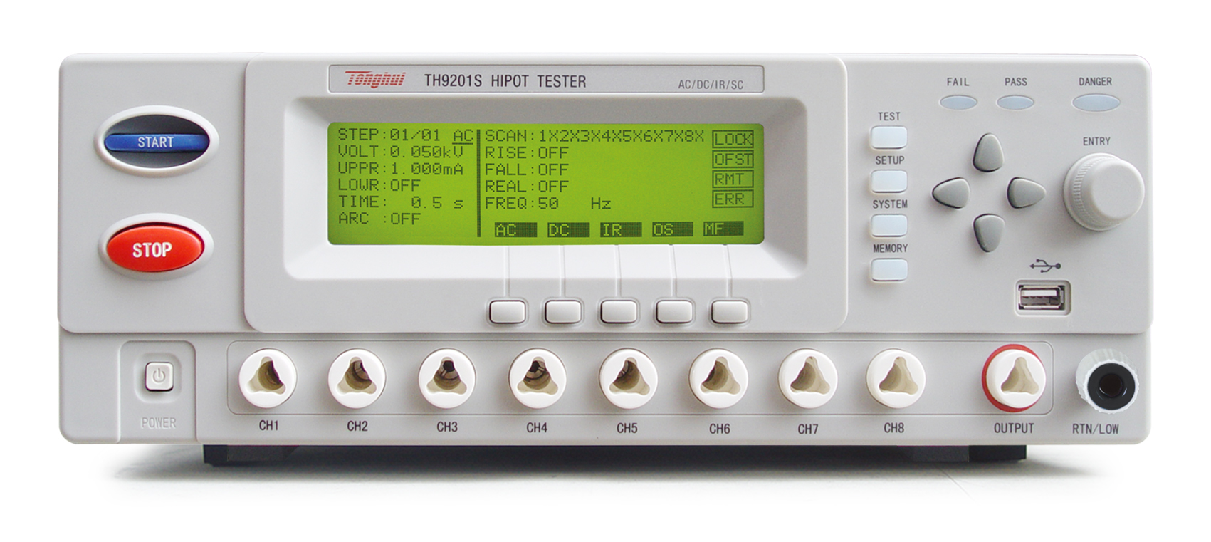 ■?TH9201S八通道交直流耐压绝缘测试仪是一种为客户精巧设计的电气安规测试仪器。精简和紧凑的结构、成熟的技术。全新的结构和操作界面使操作和使用都更简便。包含更多实用的功能。TH9201S产品可广泛应用于变压器、设备、元器件特别是绕线元件的安全检查。