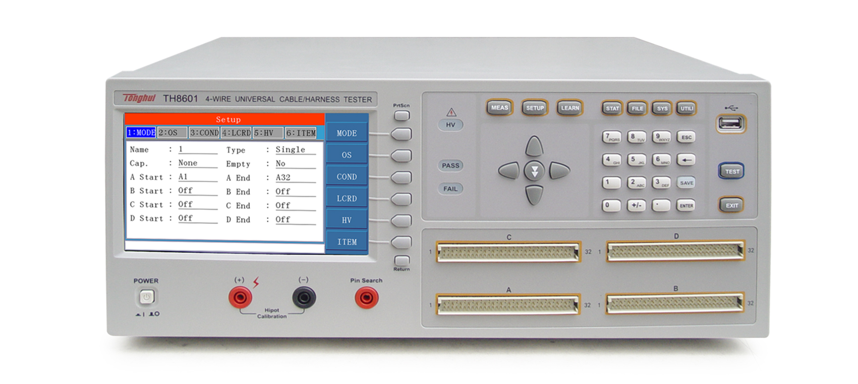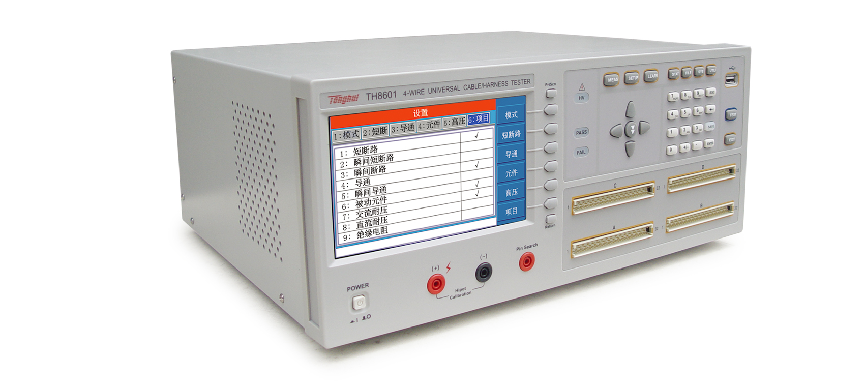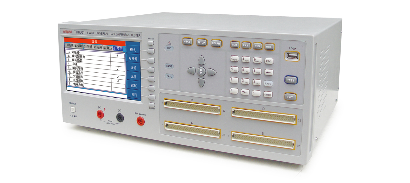 ■?TH8601系列四端线材综合测试仪是专用于各种线缆,线束和排 线品质及连接可靠性检验的多功能,自动化的线材综合参数测试 系统。该系统提供可编程的恒流恒压源以及高压源,测试项目涵盖了导通,被动元件(电感,电阻,电容,二极管),交直流耐压,绝缘电阻各种高低压参数。本系统采用先进的LCR数字采样及高速长寿命通道切换技术,大大提高了测试精度,速度以及使用寿命。采用高低压分离技术,大大的提高绝缘电阻的测试性能。丰富的接口设计,本仪器还提供RS232, RS485, GPIB, USB, LAN, Handler等接口,便于用户运用于自动化检测和自动化产线。