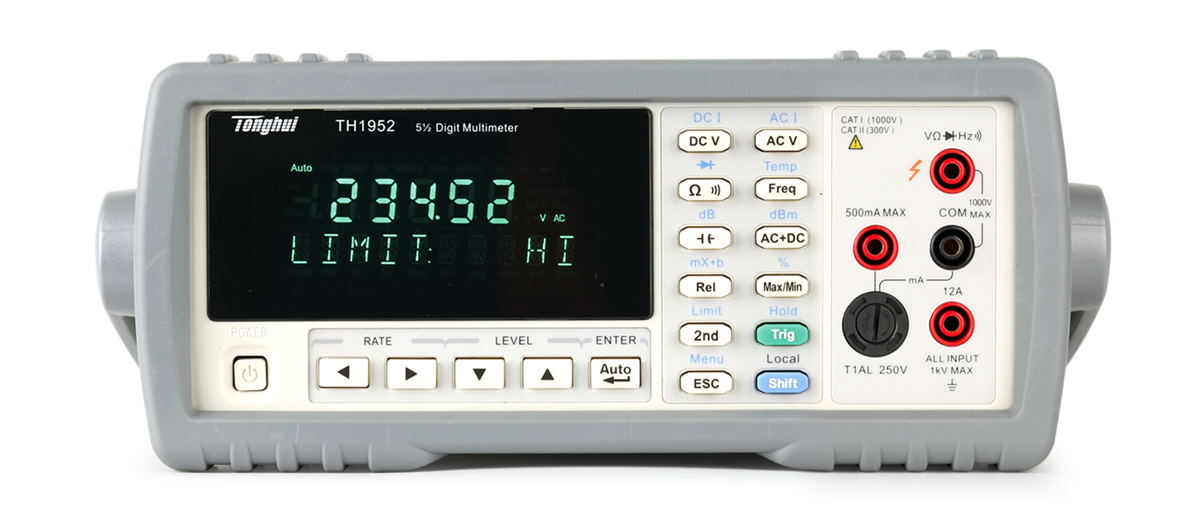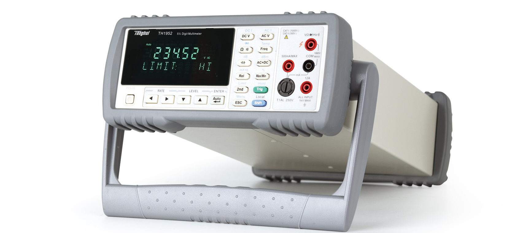 ■ TH1952型5 1/2 位真有效值数字多用表是一种多功能、物美价廉的电压/电流/电阻/电容测试仪。仪器提供120000字的最大读数,200次/秒最大ADC采样速度,0.02%的直流电压准确度等一系列优良的性能和经济的价格为广大客户提供最优的选择。TH1952提供高亮度VFD双参数显示器,可以同时测量/显示交流/直流电压或者电流、交流电压/电流和频率等参数,不仅大大提高了测量效率,而且测试显示一目了然。 仪器配备了USB通讯接口,同时可以提供通用的通讯软件以 满足与计算机的通讯、数据分析、统计、构建自动测试系统的需要。仪器接受SCPI(编程仪器的标准命令)命令,以保证通讯软 件的兼容性。本仪器同时提供可Handler接口,可接受外部触发和输出分选信号,方便生产线上的产品分选。