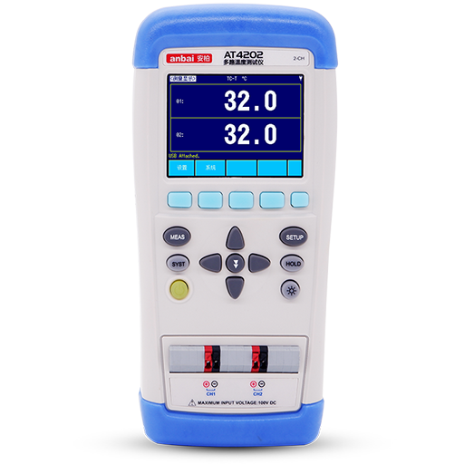 AT4202手持式多路温度测试仪采用高性能32位ARM微处理器控制,可同时对2路温度数据进行采集,上超下超报警和通讯传输,兼容K/N/E/J/T/R/S/B型热电偶,响应速度快,数据稳定,同时具备断偶检测功能。超低功耗设计和高密度SMD装配工艺,真彩TFT液晶显示屏,并具有键盘,触摸屏 双控制。采用锂电池供电,USB通讯。中英文操作界面可快速切换。仪器标配的数据采集软件为您进行数据分析提供强有力的支持!