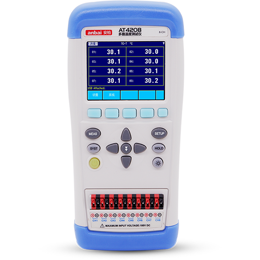 AT4208手持式多路温度测试仪采用高性能32位ARM微处理器控制,可同时对8路温度数据进行采集,上超下超报警和通讯传输,兼容K/N/E/J/T/R/S/B型热电偶,响应速度快,数据稳定,同时具备断偶检测功能。超低功耗设计和高密度SMD装配工艺,真彩TFT液晶显示屏,并具有键盘,触摸屏 双控制。采用锂电池供电,USB通讯。中英文操作界面可快速切换。仪器标配的数据采集软件为您进行数据分析提供强有力的支持!