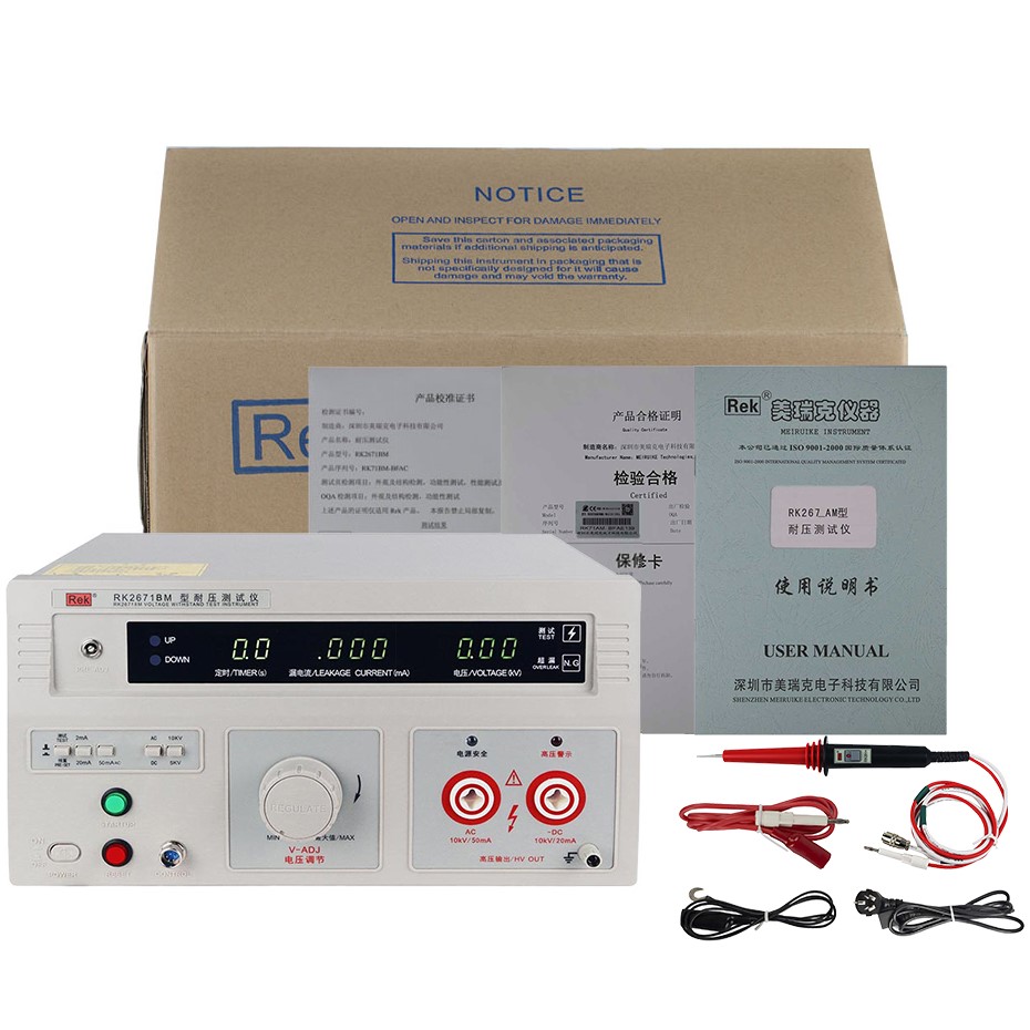 美瑞克RK2671系列耐压测试仪是测量耐压强度的仪器,可以直观、准确、快速地测试各种被测对象的击穿电压、漏电流等电气安全性能指标,并可以作为高压源用来测试元器件和整机性能。