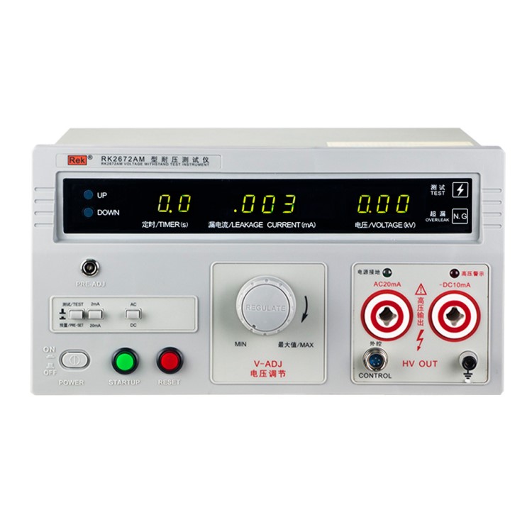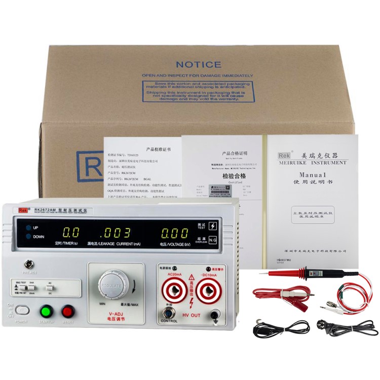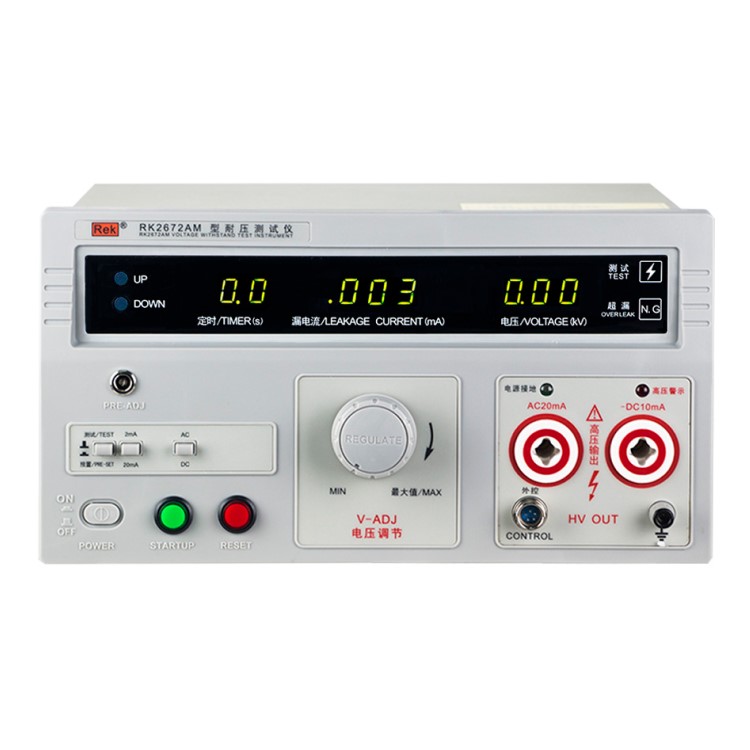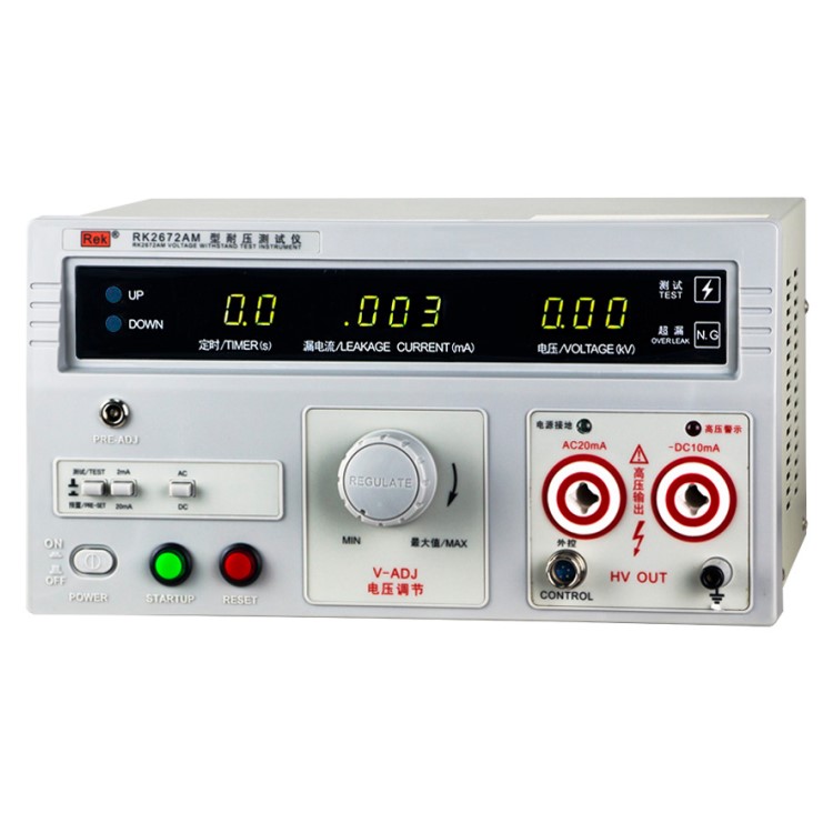 美瑞克RK2672系列耐压测试仪是测量耐压强度的仪器,可以直观、准确、快速地测试各种被测对象的击穿电压、漏电流等电气安全性能指标,并可以作为高压源用来测试元器件和整机性能。