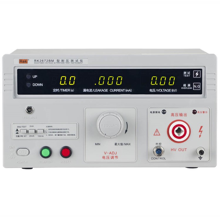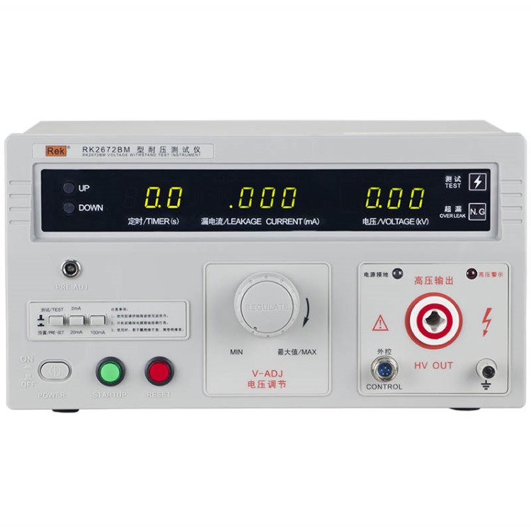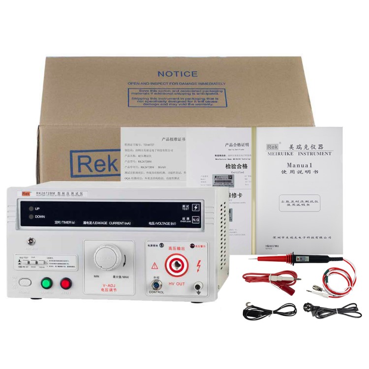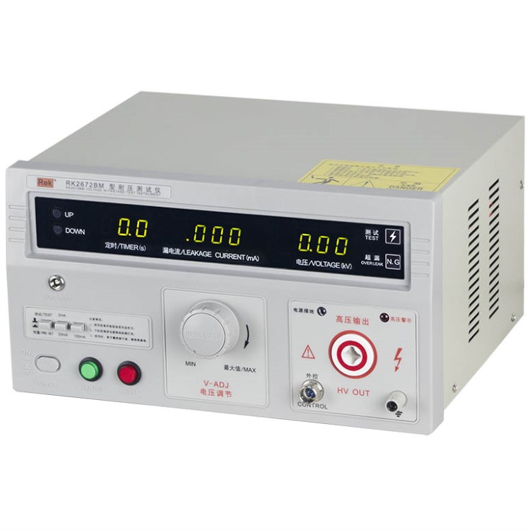 美瑞克RK2672系列耐压测试仪是测量耐压强度的仪器,可以直观、准确、快速地测试各种被测对象的击穿电压、漏电流等电气安全性能指标,并可以作为高压源用来测试元器件和整机性能。