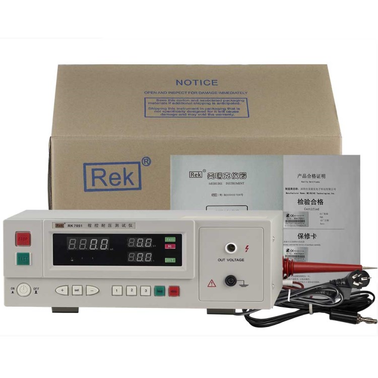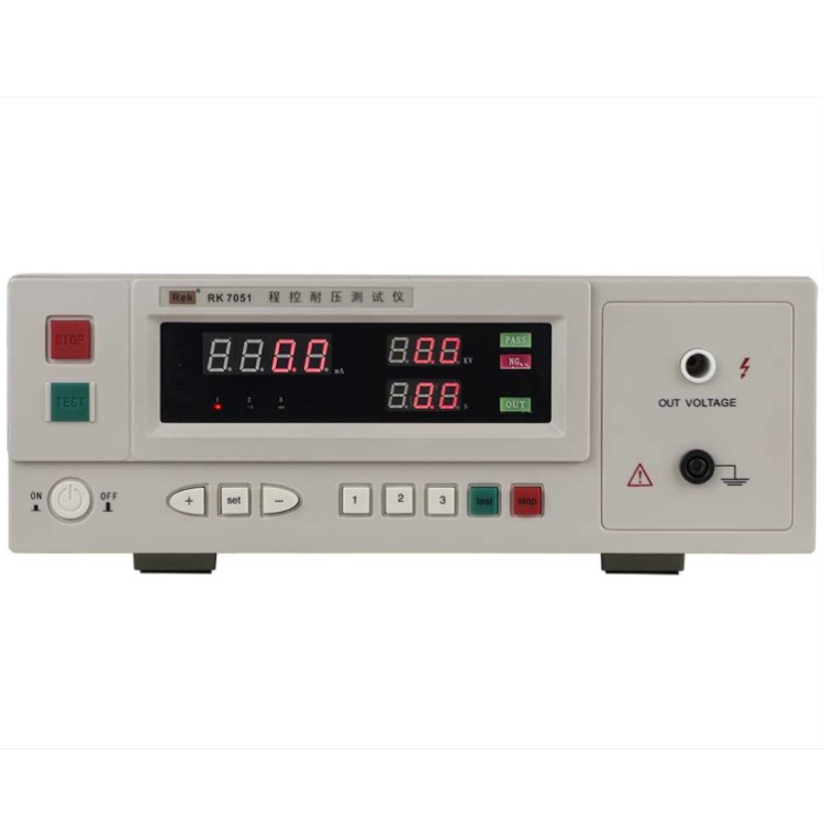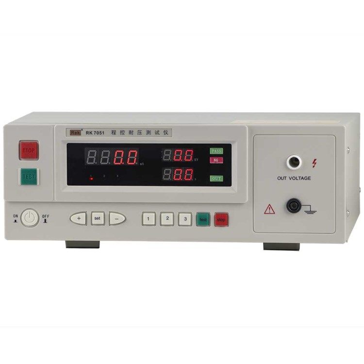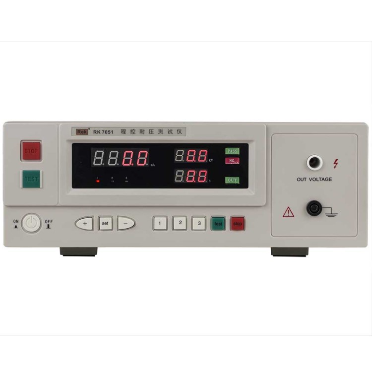 RK7051程控耐压测试仪是测量耐压强度的仪器, 可以直观、准确、快速地测试各种被测对象的击穿电压、漏电流等电气安全性能指标,并可以作为高压源用来测试元器件和整机性能。